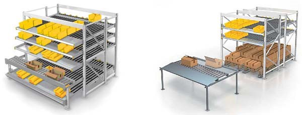 Гравитационные стеллажи для коробов предназначены для перемещения штучных грузов, картонных коробов и тяжёлых пластиковых контейнеров из места хранения или загрузки в заданном направлении в порядке загрузки.